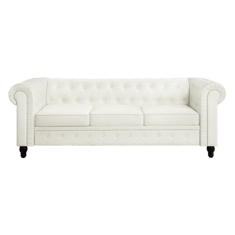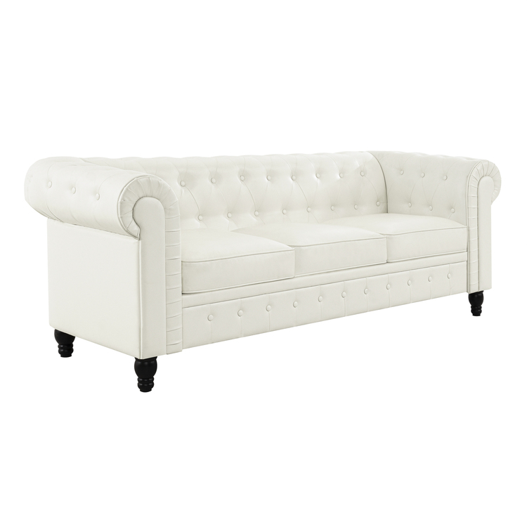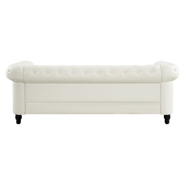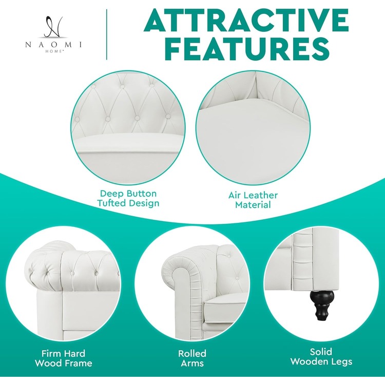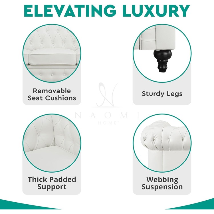 - Timeless Elegance-The Emery Chesterfield Sofawith Rolled Arms, Tufted Cushions by Naomi Home epitomizes timeless elegance and classic charm, exuding sophistication with its gracefully rolled arms and tufted cushions.