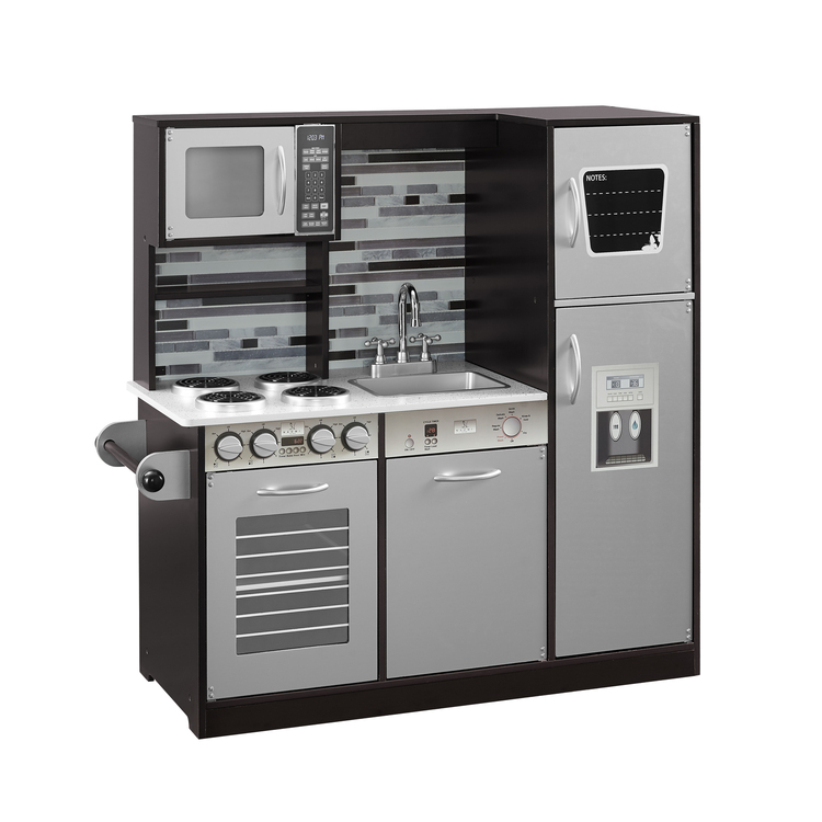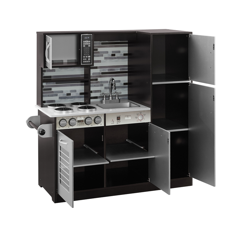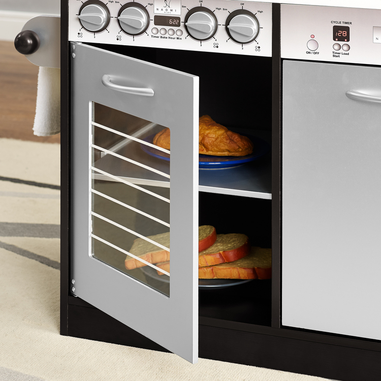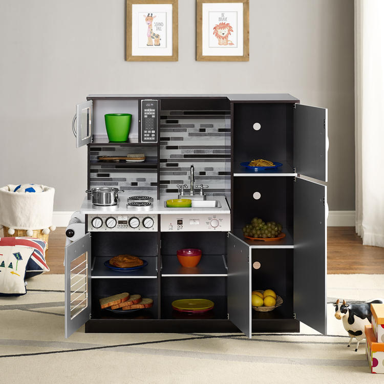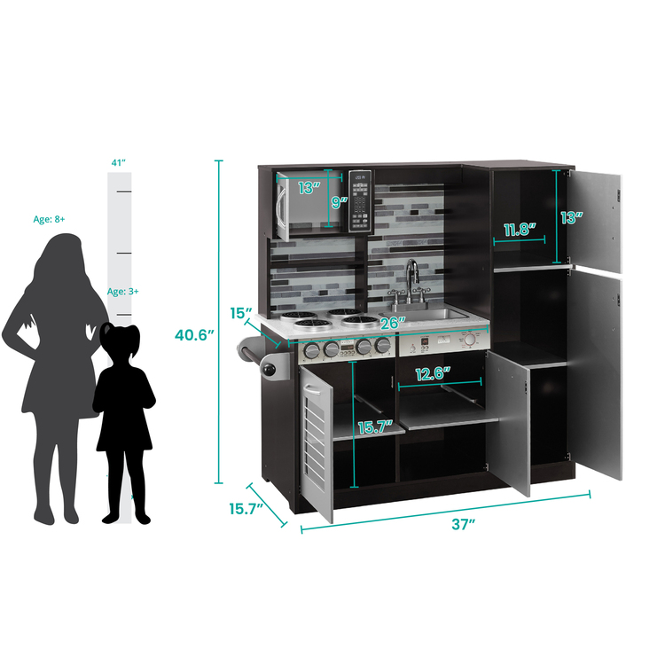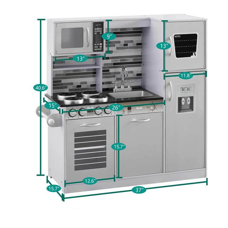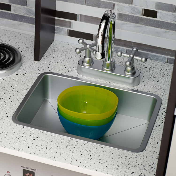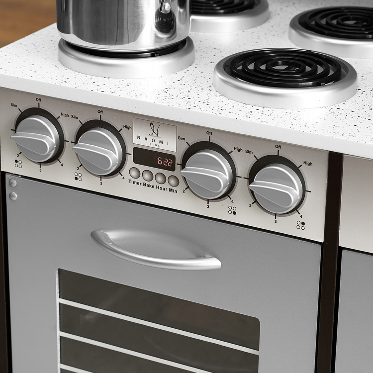 - INTERACTIVE KIDS KITCHEN SET:Kitchen Set for Kids will feel like they are cooking like adults when playing with this realistic style kid's kitchen toy. The stove with 4 BURNERS has active "clicking" knobs. The OVEN has a window and a slidable oven rack. The CHROME FAUCET is movable with turnable handles. Faux White with a Black Granite Counter Top.