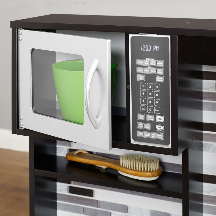 - CONVENIENT STORAGE SPACE, COOL GRAPHICS:Spice Shelf under Microwave; Refrigerator, Freezer, Microwave, Oven, and Dishwasher doors all open and close. The Refrigerator has one shelf with an ice/water dispenser graphic; the freezer has a chalkboard for notes.