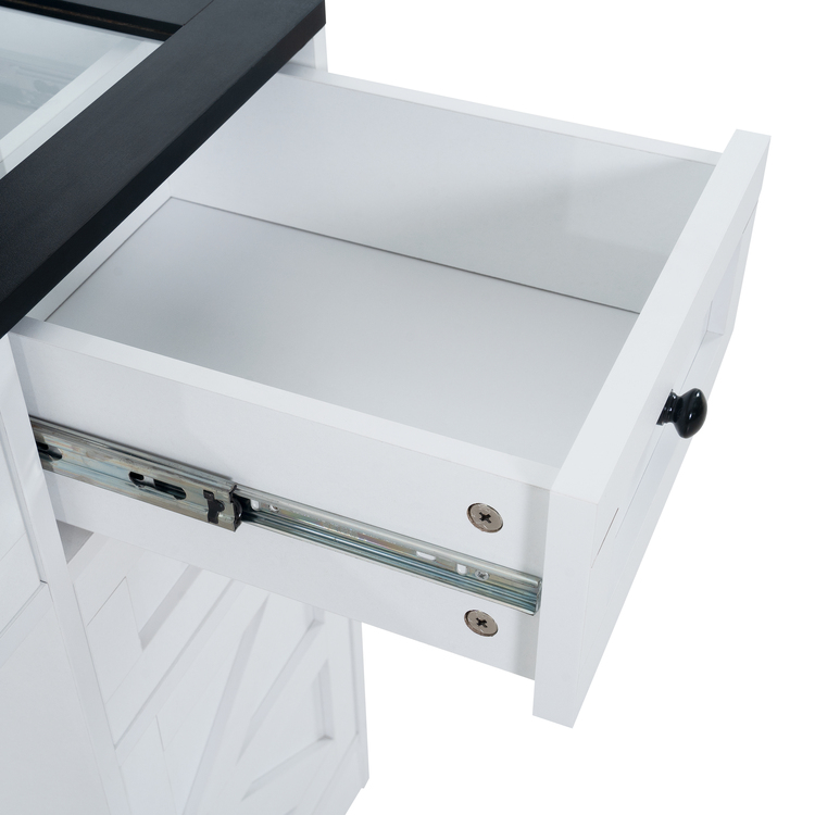 - Storage: 5 pullout drawers, 2 lower storage compartments with doors, 2 shelves behind mirror