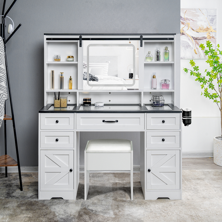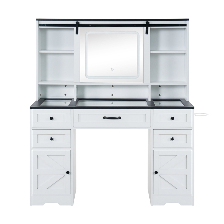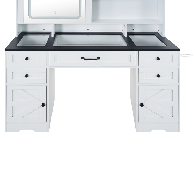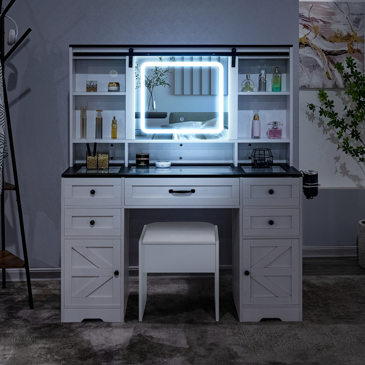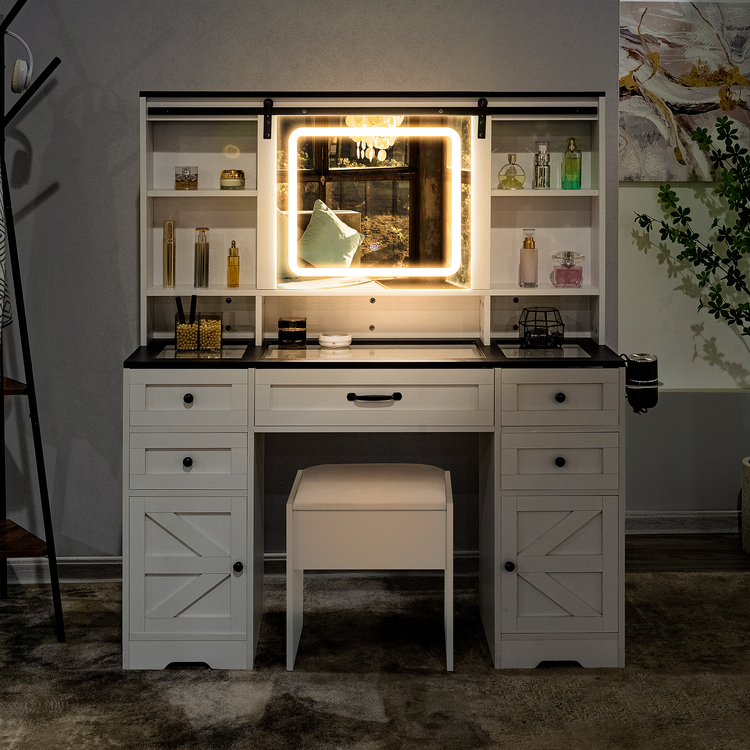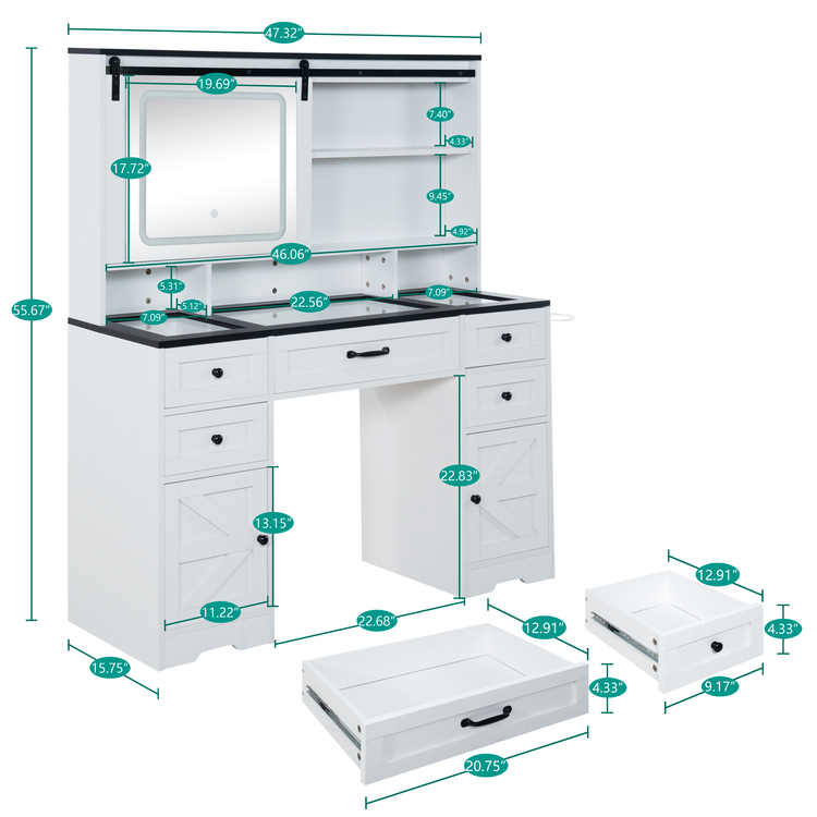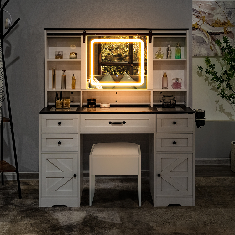 - Hidden Shelves and Smart Storage Design-Maximize space with two shelves tucked neatly behind the mirror - perfect for items you use less frequently. Additional storage includes five pullout drawers for daily beauty tools, plus two large compartments with farmhouse-style doors to organize larger items.