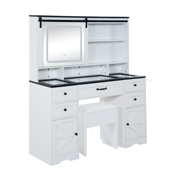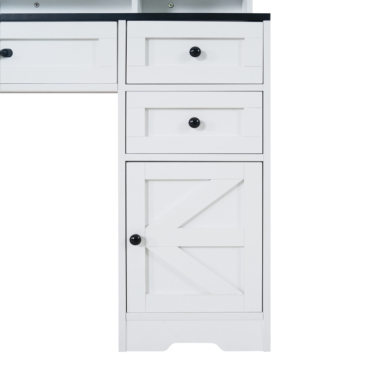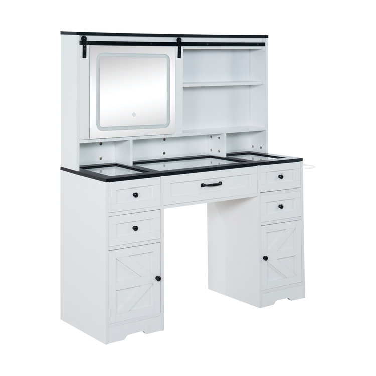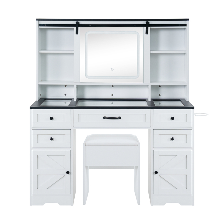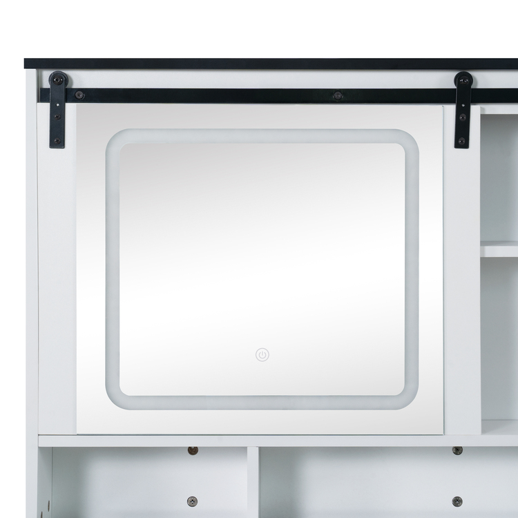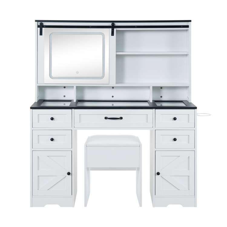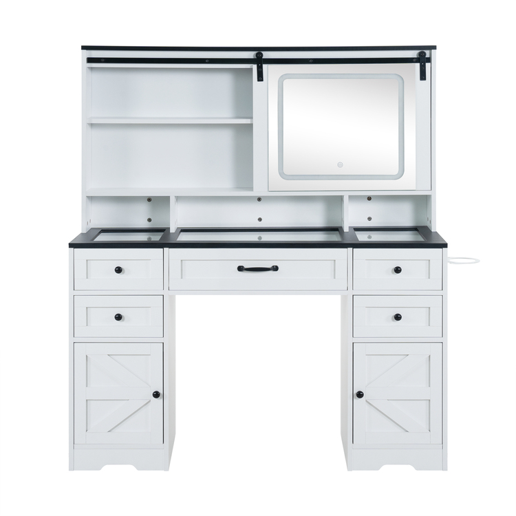 - Hidden Shelves and Smart Storage Design-Maximize space with two shelves tucked neatly behind the mirror - perfect for items you use less frequently. Additional storage includes five pullout drawers for daily beauty tools, plus two large compartments with farmhouse-style doors to organize larger items.